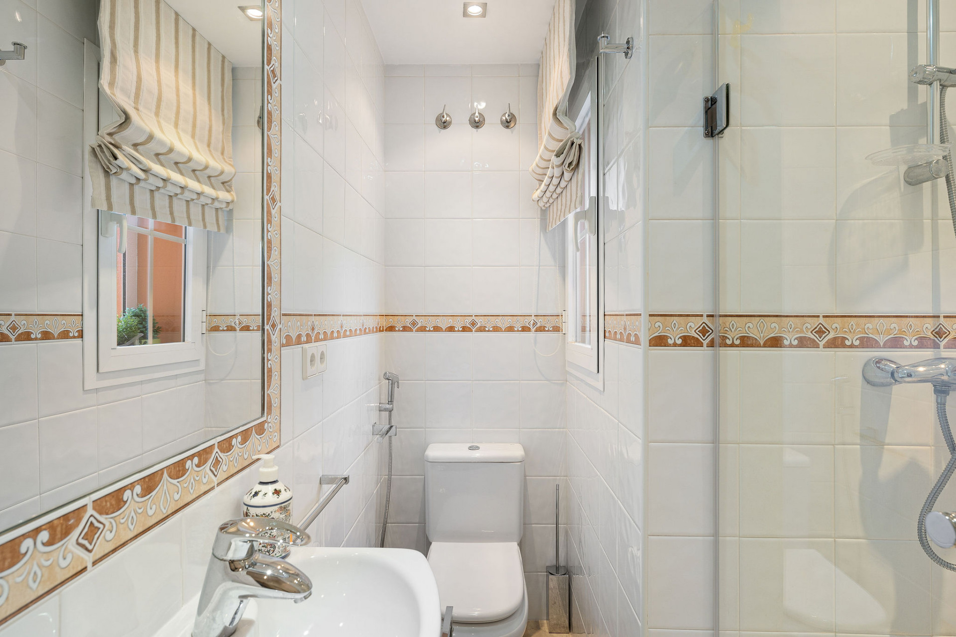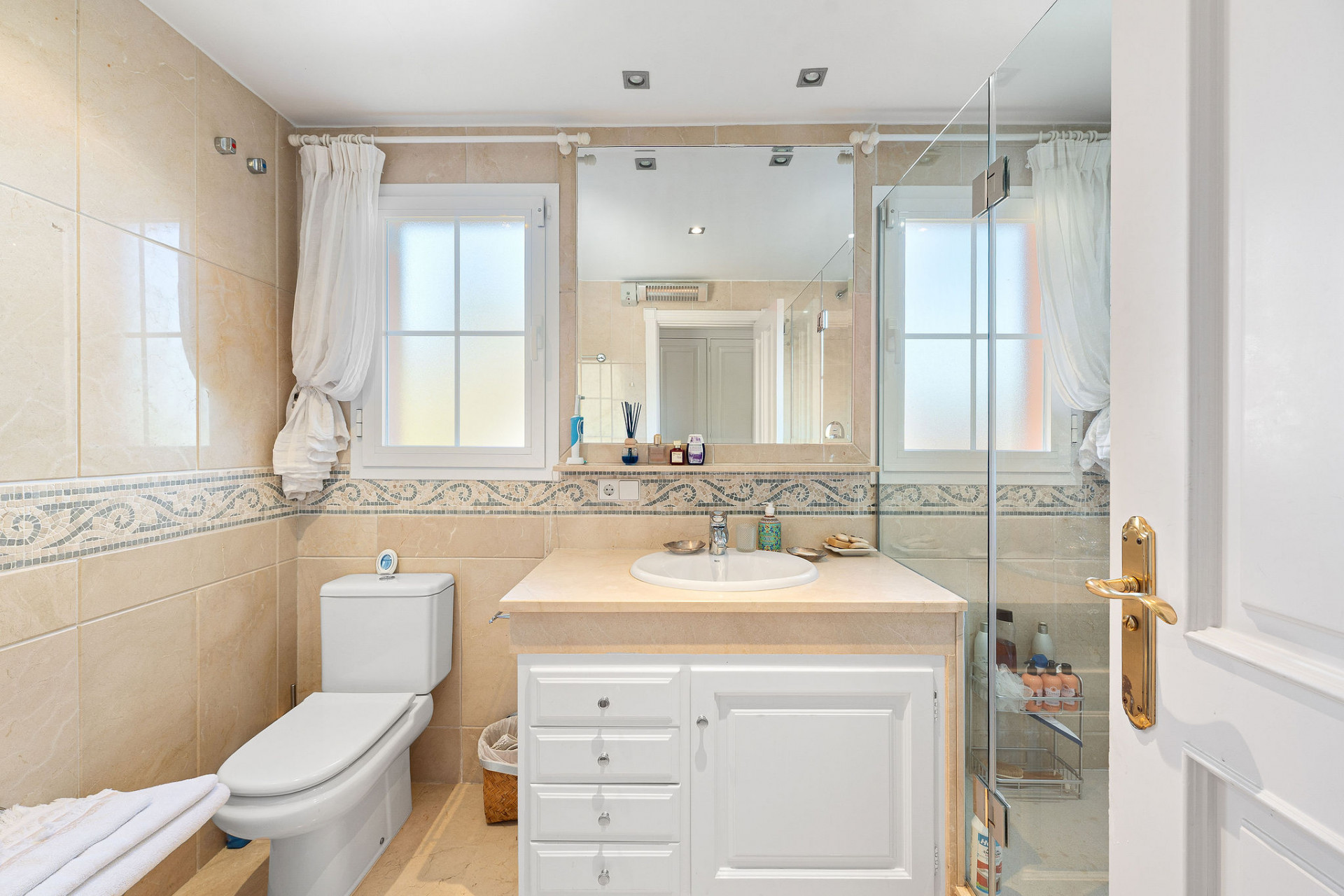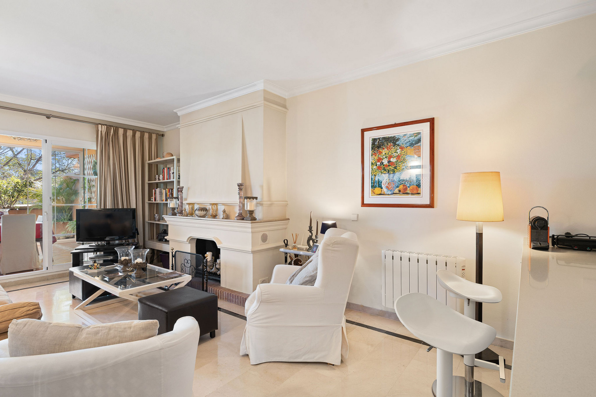 The main level features a bright living room with a cosy open plan fireplace and a fully fitted open plan kitchen, ideal for both everyday living and entertaining. From the living area there is access to a covered terrace enclosed with glass doors, currently used as a dining room and seamlessly extending the interior living space. On this level you will also find the master bedroom with en-suite bathroom and a private terrace that connects directly to the glassed terrace, providing a wonderful indoor-outdoor flow. In addition, there is a guest bedroom with en-suite bathroom and a third bedroom with a separate bathroom, offering comfort and privacy for family and visitors alike.
